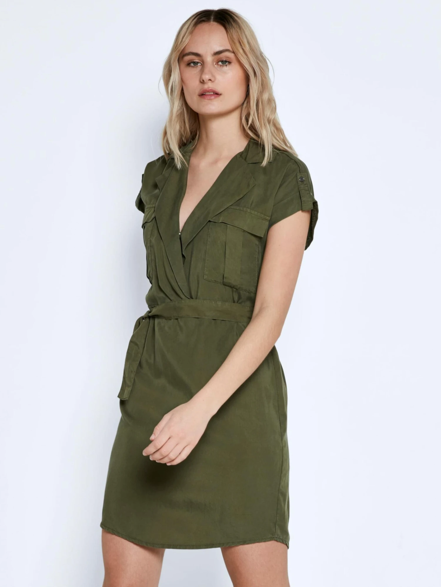 EffenLyocellV-halsGedrapeerdWikkel designGevoerde zoom/randMouw reversMet band/snoerRevers kraagTaillebandBorstzakOpzet-/flapzakKnop sluitingOp staal nadenVoelt zacht aanTENCEL™ Lyocell*