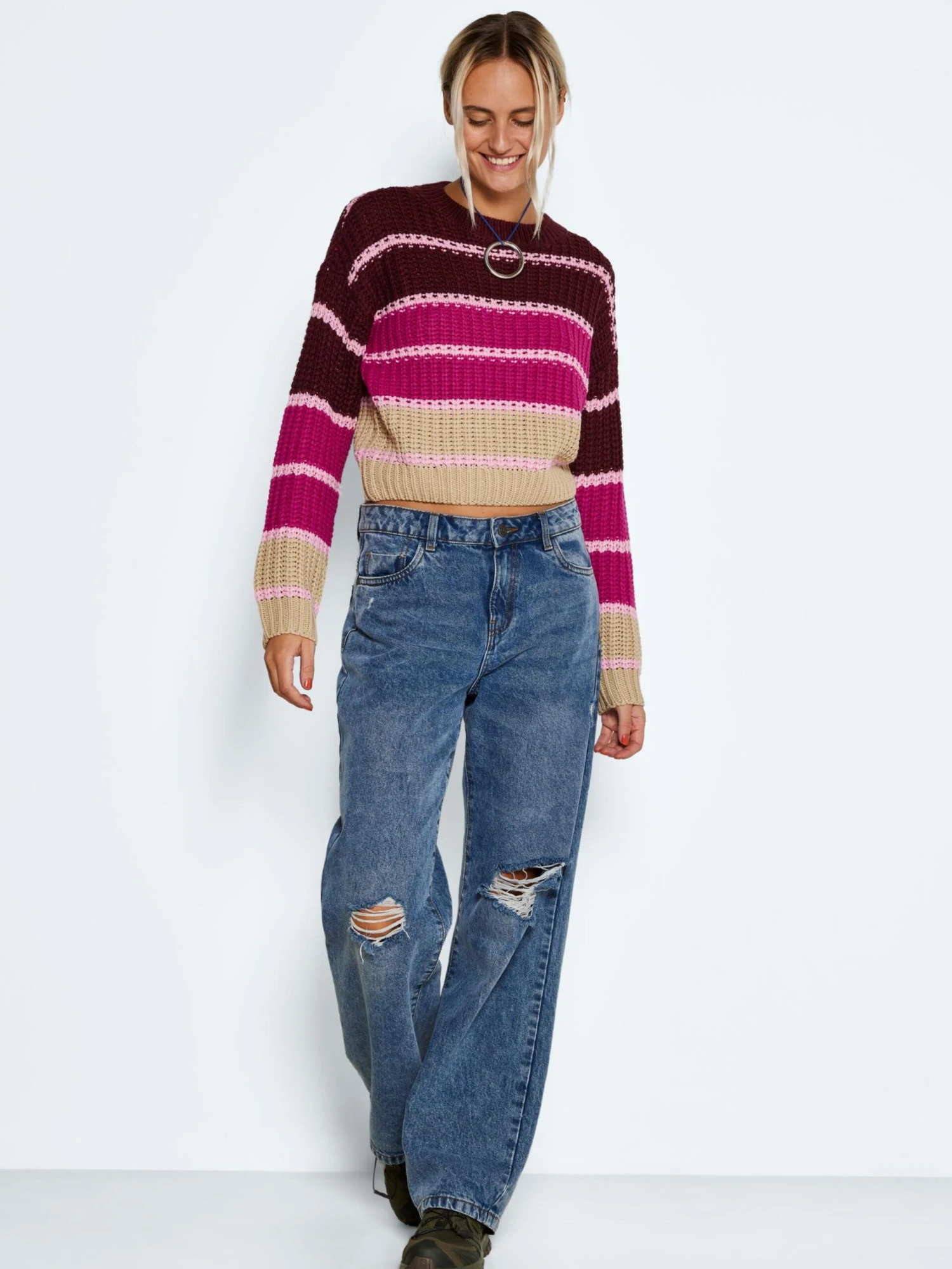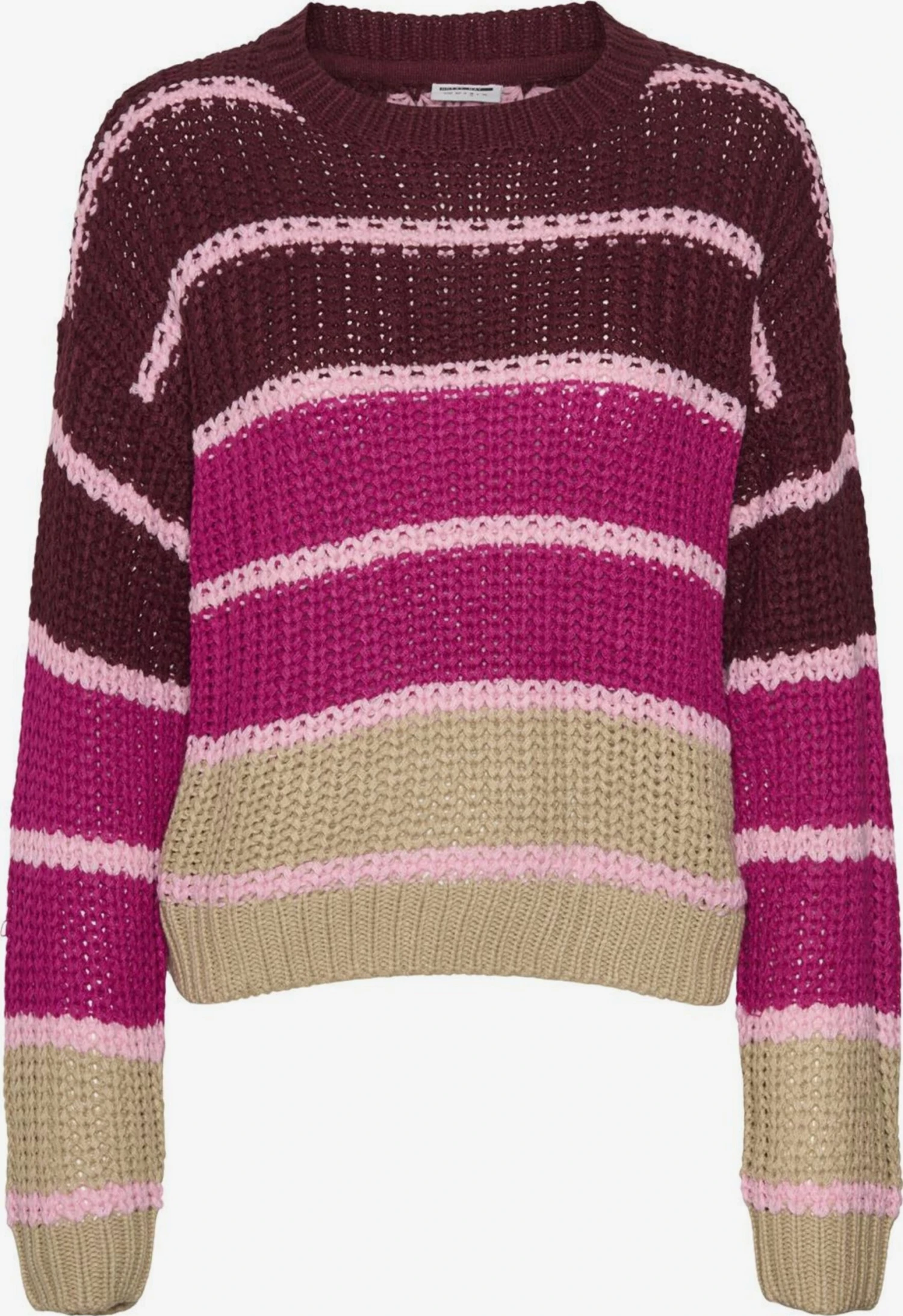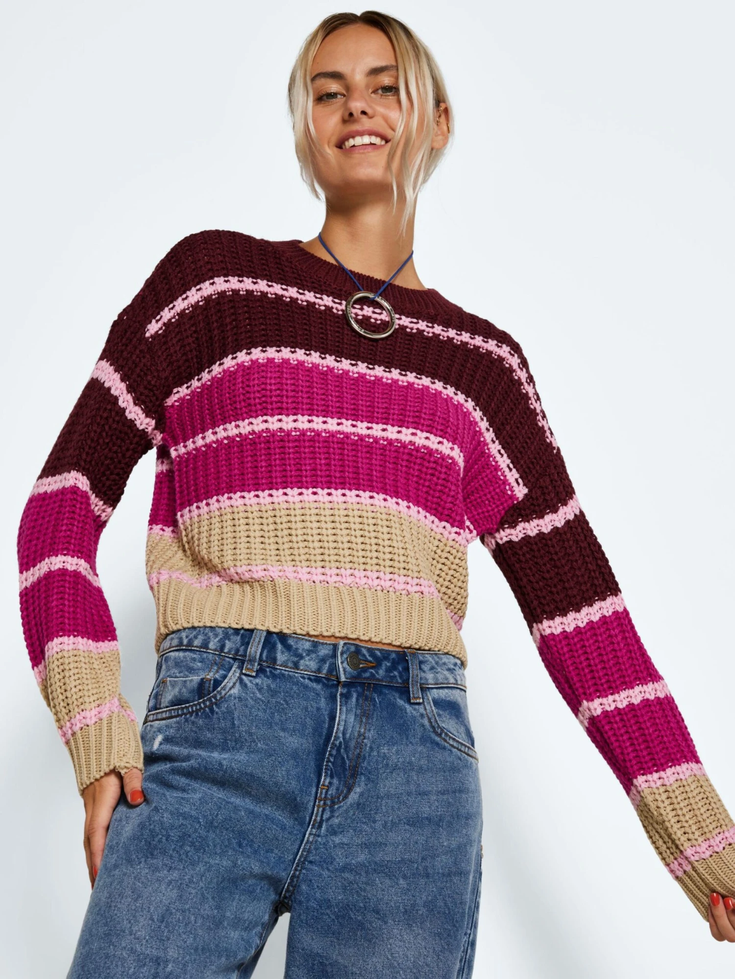GestreeptRonde halsGeribbelde kraagRechte zoomGeribd ceintuurtjeOvercut schouderFully fashionedMet textuur