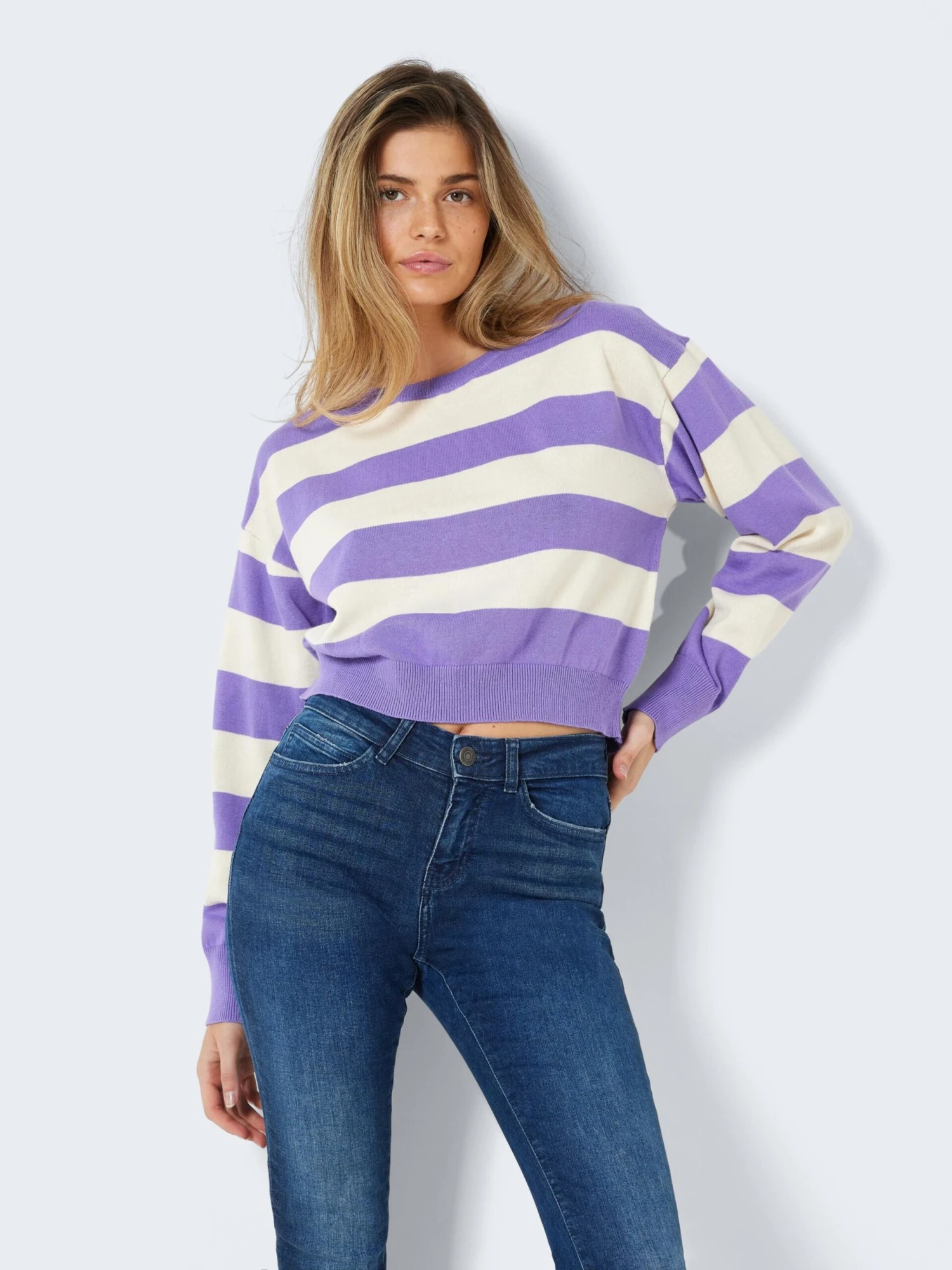 GestreeptKatoenRonde halsGeribbelde kraagGeribd ceintuurtjeOvercut schouderAll-over patroonVoelt zacht aan