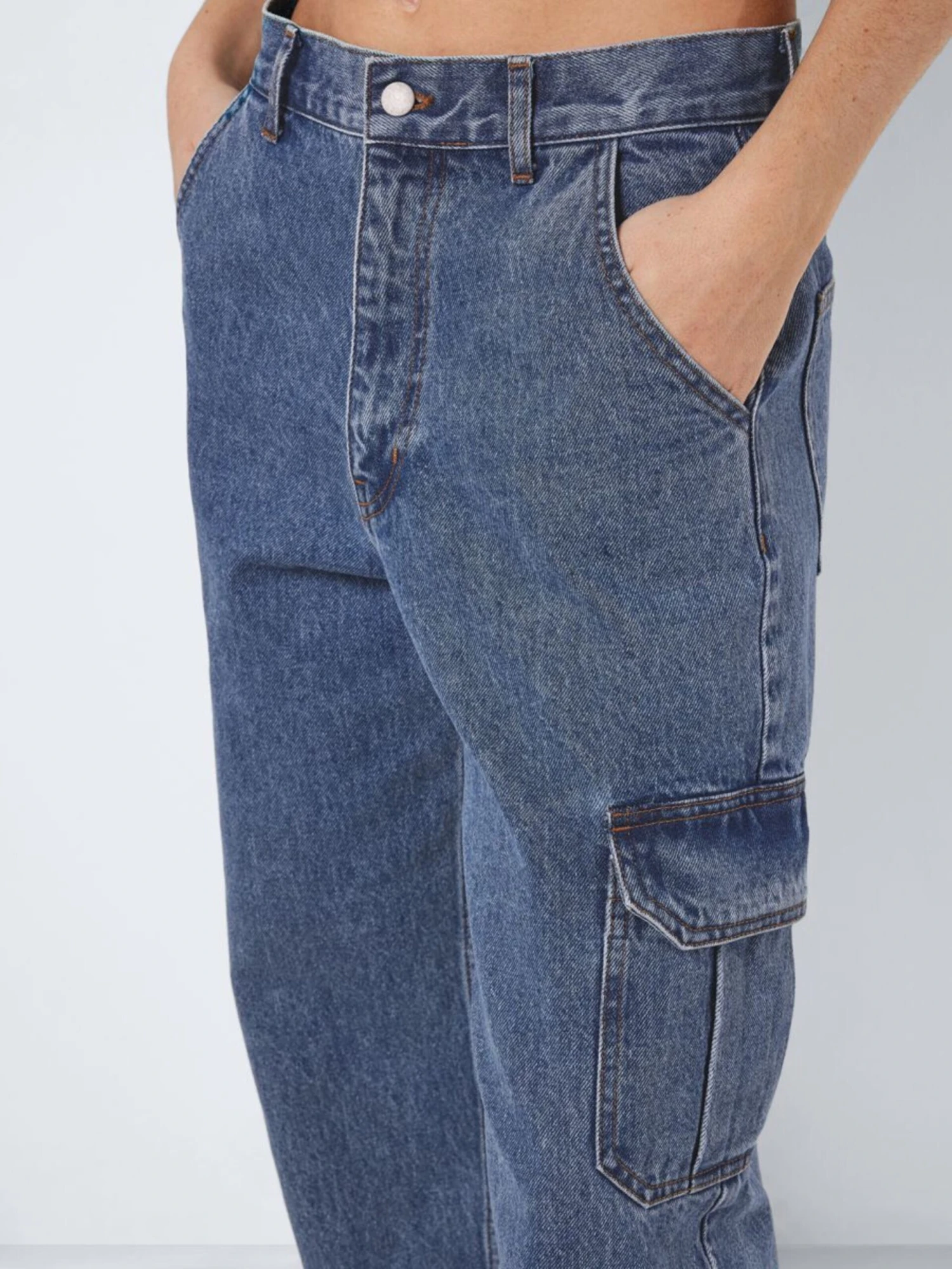 EffenDenimHeavy washedGevoerde zoom/randRitssluitingCargozakAchterzakZakken aan de zijkantContrasterende nadenGewassen effectVaste gripStevige stofRiemlussenRitssluiting