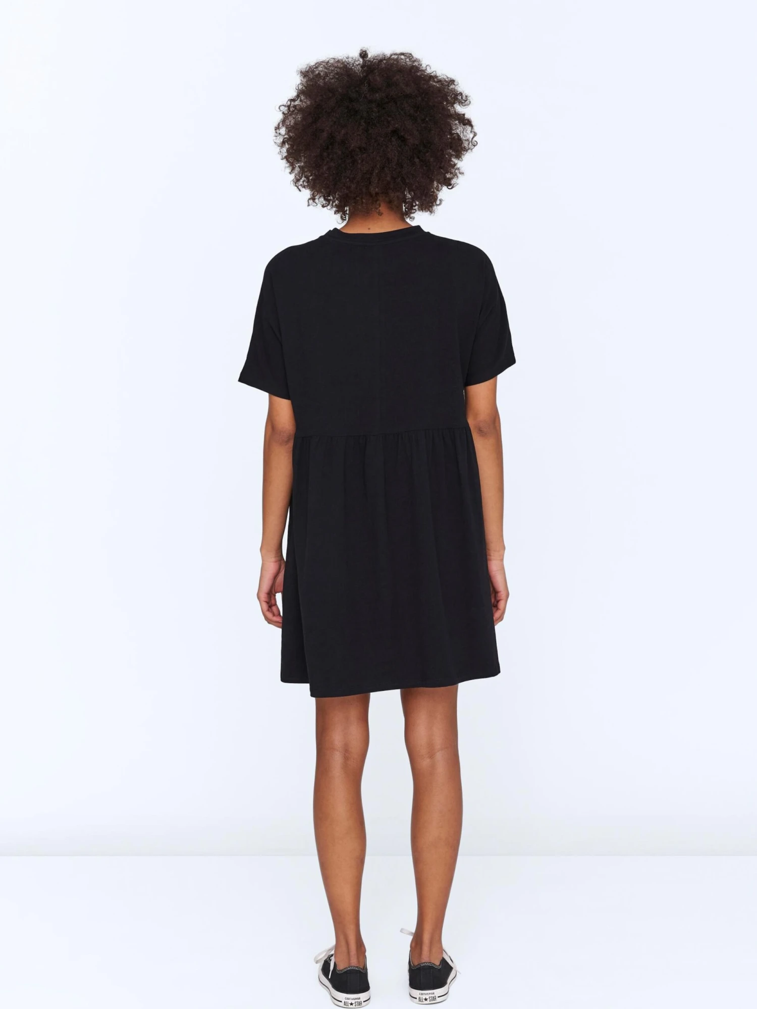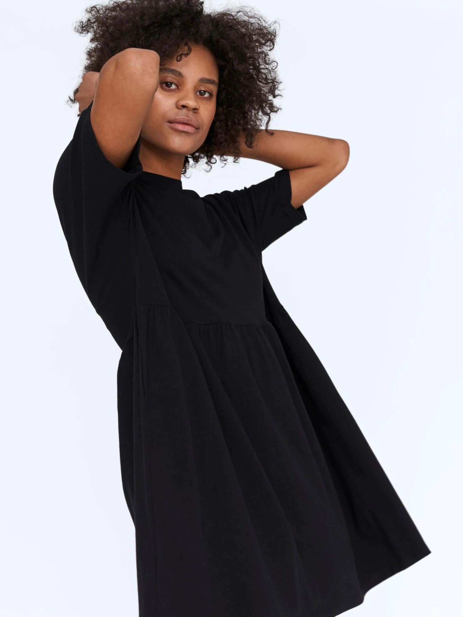 EffenJerseyRonde halsGedrapeerdGevoerde zoom/randFlareGeribbelde kraagRechte zoomNektapeOp staal nadenVoelt zacht aanKatoen (biologisch geteeld)