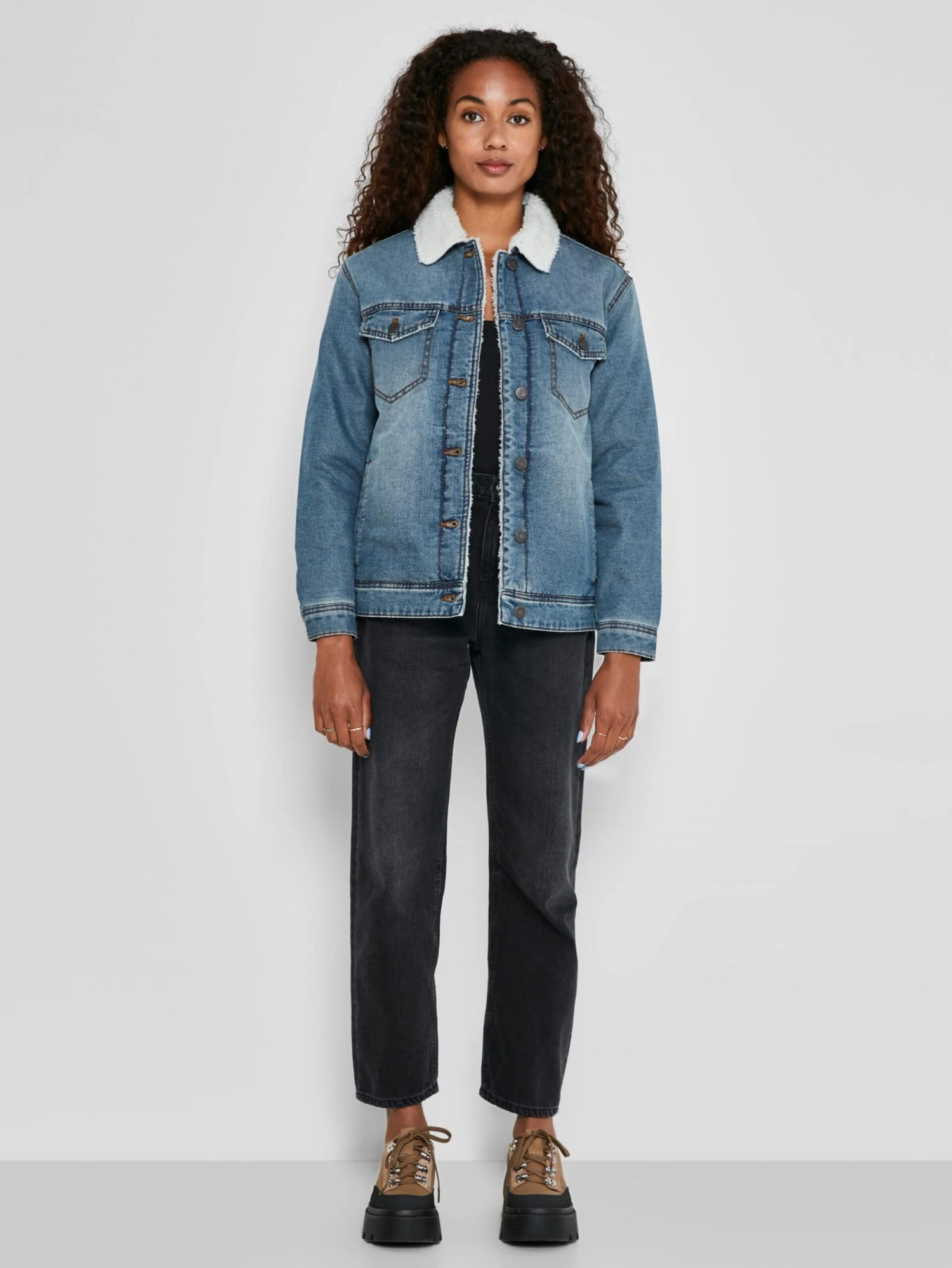 EffenDenim1-knoops manchettenTurn-down kraagBorstzakZakken aan de zijkantTeddy voeringContrasterende nadenGewassen effectVaste gripLicht gevoerdKnoopsluiting