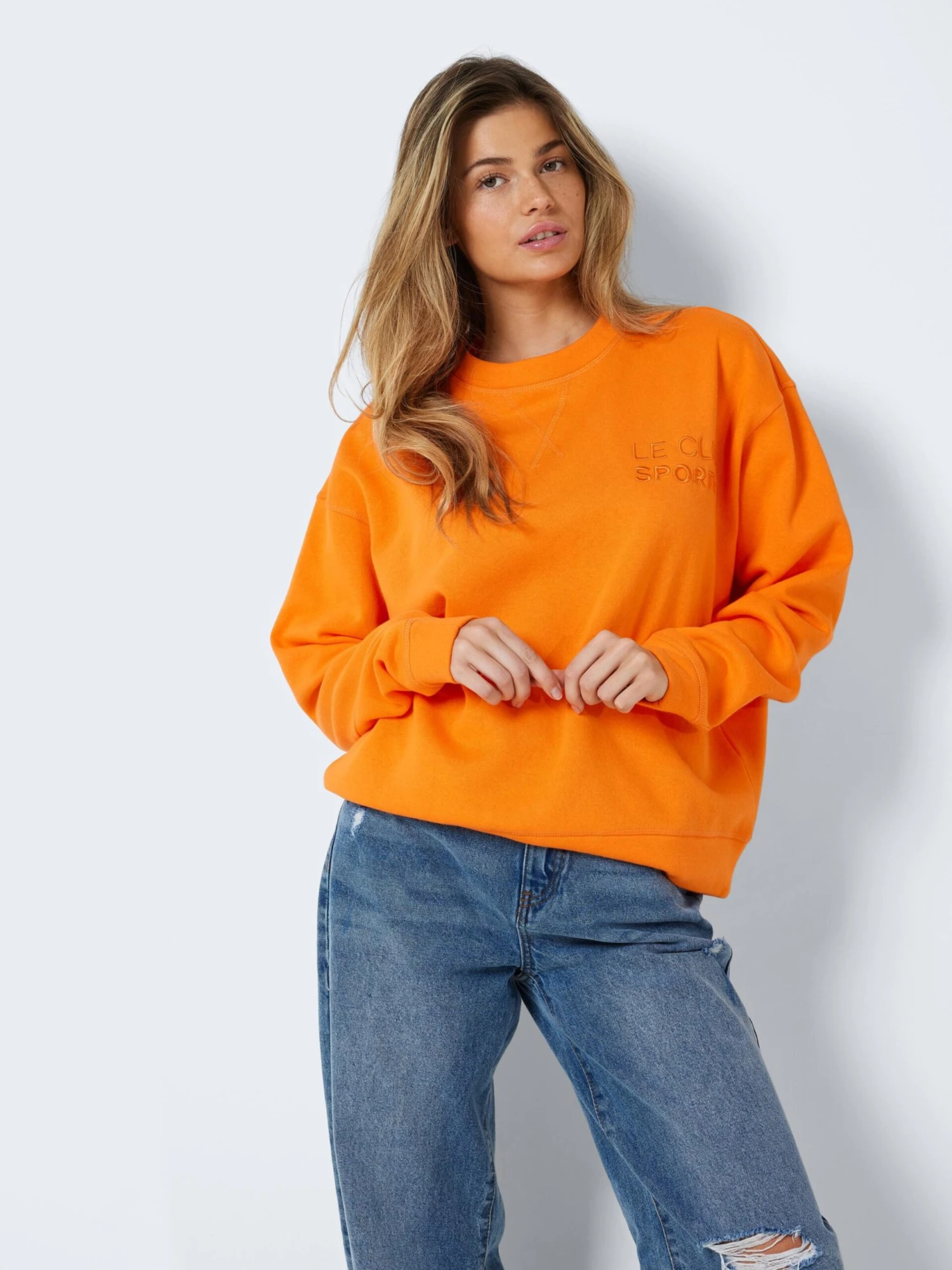 EffenSweatstofRonde halsBorduurselsGeribbelde kraagGeribd ceintuurtjeOvercut schouderSiernaadOp staal nadenVoelt zacht aan