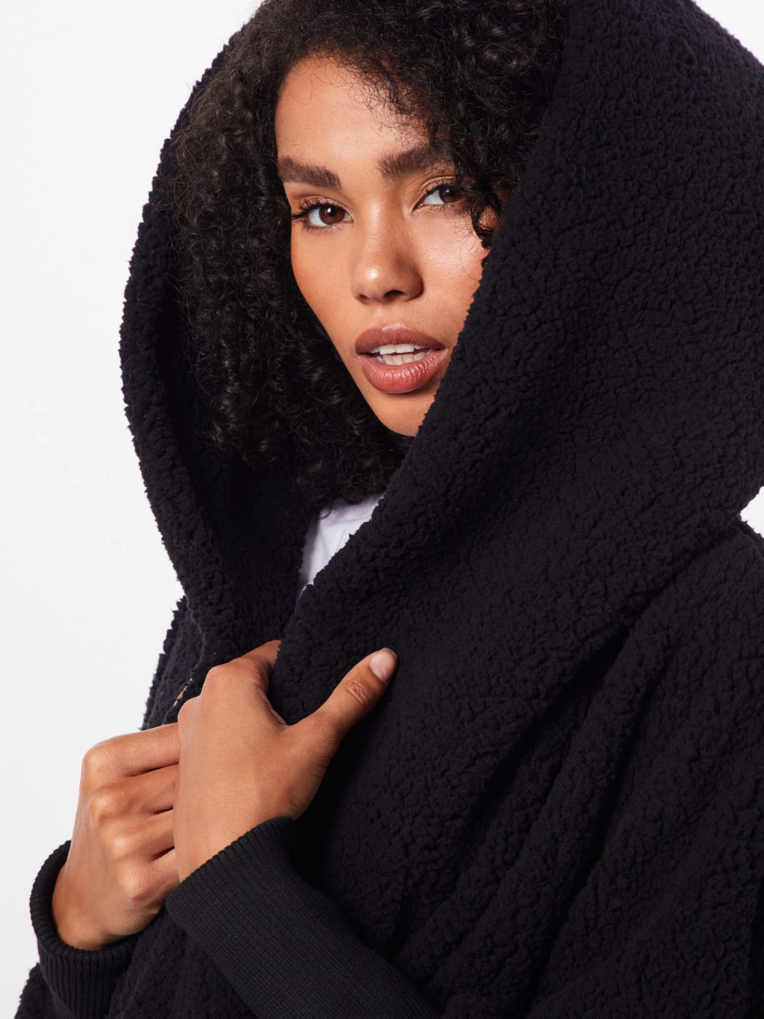 EffenDrukknopsluitingRechte zoomMet capuchonO-vormGeribd ceintuurtjeFleece binnenvoeringVoelt zacht aanNiet gevoerd