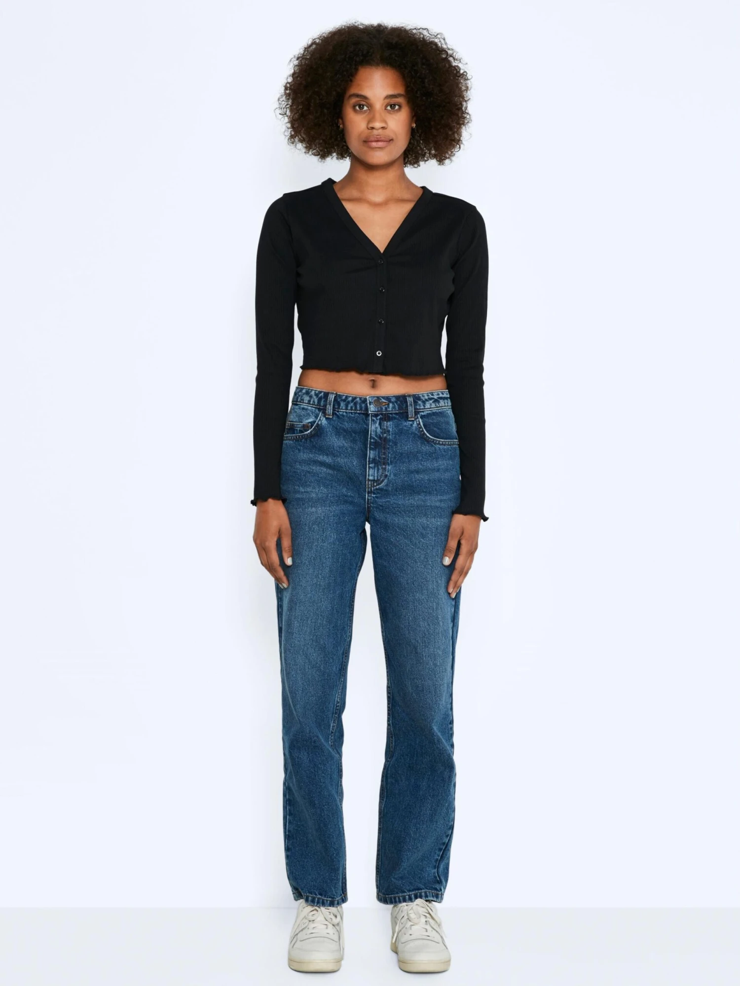 EffenKatoenV-halsKnop placketGeribbeld gebreidIngelegde kraagGeschulpte zoomOp staal nadenMet textuurVoelt zacht aanKnoopsluitingKatoen (biologisch geteeld)