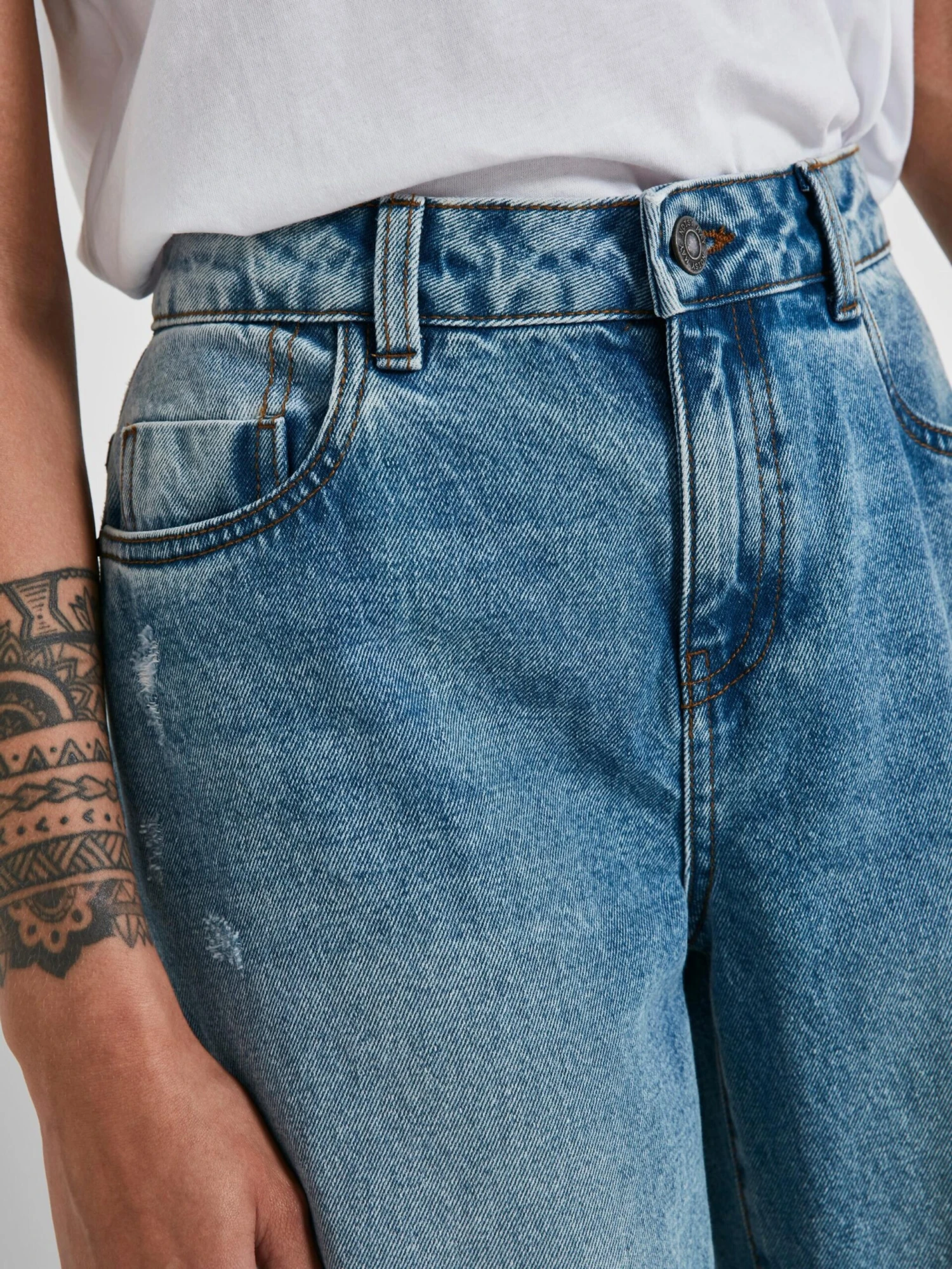 EffenDenimrippedGevoerde zoom/randRitssluiting5-pocket-styleContrasterende nadenLabel patch/label flagUsed-lookGewassen effectVaste gripRiemlussenRitssluitingKatoen (biologisch geteeld)
